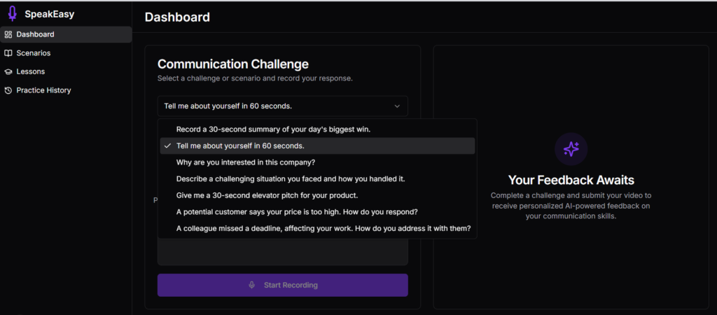 The Solution: We created a dark-mode, distraction-free “Situational Practice” interface. Users can engage in specific tracks like Job Interview, Sales Pitch, and Conflict Resolution, supported by a structured curriculum of lessons and practice history.